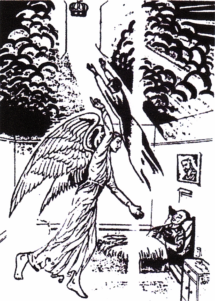 En lugar del temible esqueleto (muerte) se ve en este último cuadro, al ángel o mensajero de Dios. Está esperando llevar al justificado espíritu de retorno a Dios. El alma y el espíritu están desprendidos de los lazos del cuerpo mortal y vuelan por las puertas abiertas del cielo al seno de aquel a quien su alma ha amado, por quien él vivió y murió sobre la tierra.