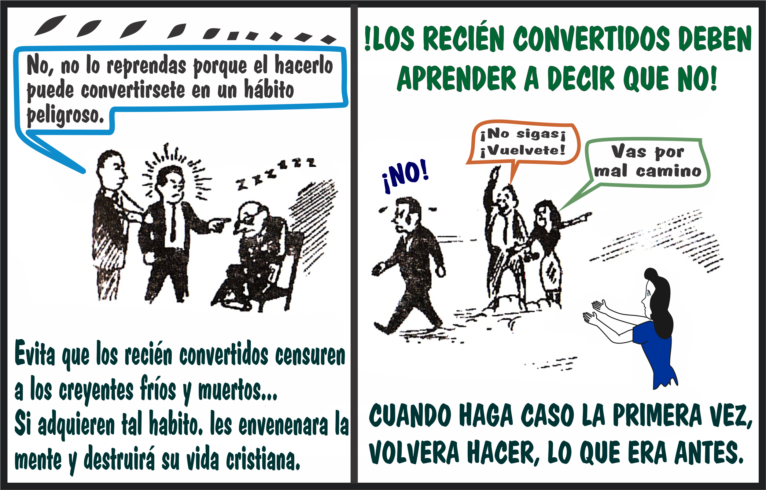 La iglesia debe cuidarlos y señalarles los peligros, igual que la madre amorosa cuida de los hijos pequeños, Los recién convertidos desconocen los peligros que les rodean. Desconocen los ardides del diablo, las tentaciones del mundo. El poder de sus propias pasiones y hábitos y otros innumerables peligros. Si no se les cuida y aconseja debidamente, caerán en ellos. Reprendedles con suavidad Cuando los cristianos crean necesario reprender a un recién convertido, deben hacerlo con extremo cuidado. Los miembros más maduros de la Iglesia deben cuidar fielmente a los recién convertidos, y si éstos empiezan a perder terreno o a desviarse del camino, deben amonestarlos en seguida y, si es necesario, reprenderlos. Pero si no se va a hacer como se debe, es mejor no hacerlo.